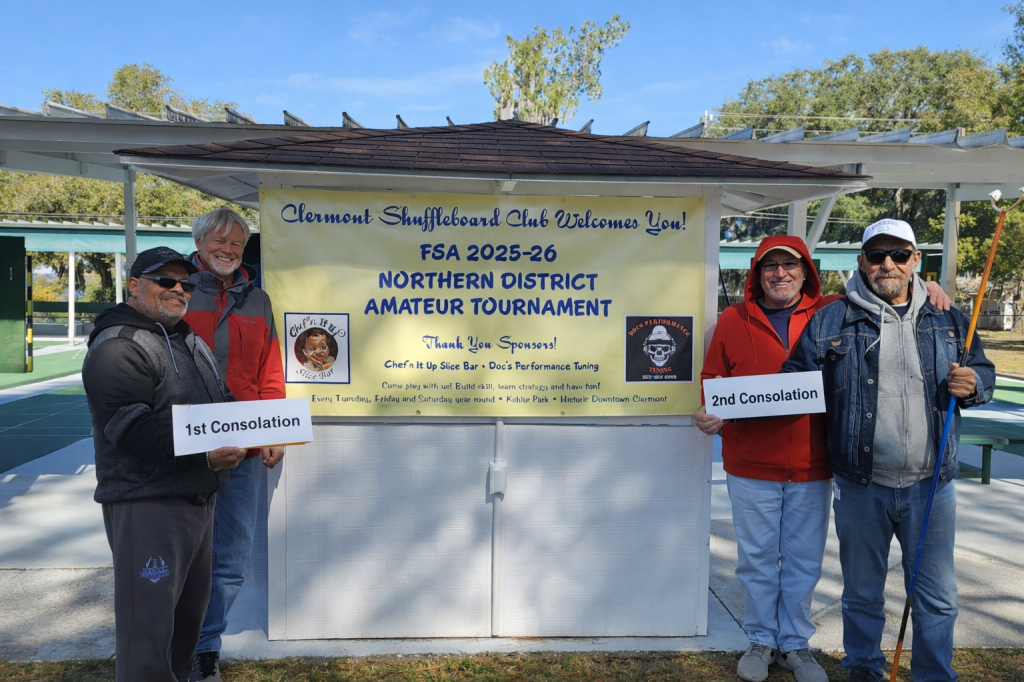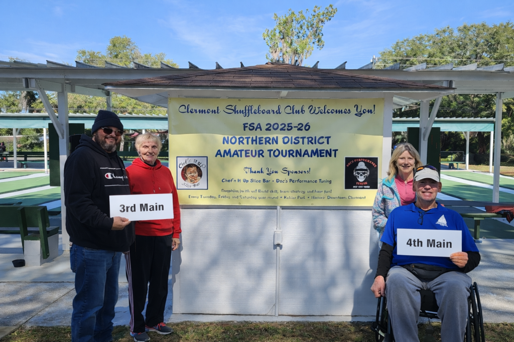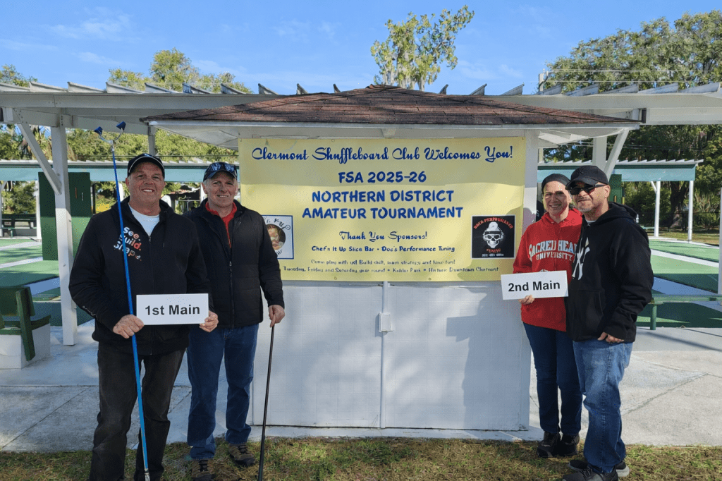 The Clermont Shuffleboard Club hosted the ND16 Any Amateur Doubles tournament on 1/19/26. Steve Clark was the director and the sponsors were Chef n It Up Slice Bar and Doc’s Performance Tuning. Congratulations to all the shufflers.