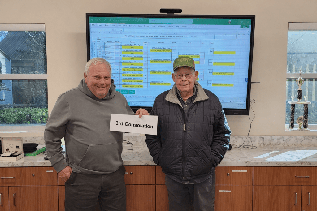 ND15 – No Two Pros – Hawthorne – 1/15/26 – 33 Teams MAIN: 1. Al Dronsfield & Richard Tallman – Leesburg 2. Lyle Walker & Tim Ash – Hawthorne 3. George Snyder & Paul Ayotte – Hawthorne/Leesburg 4. Tom Basner & Greg Hunter – Holiday RV