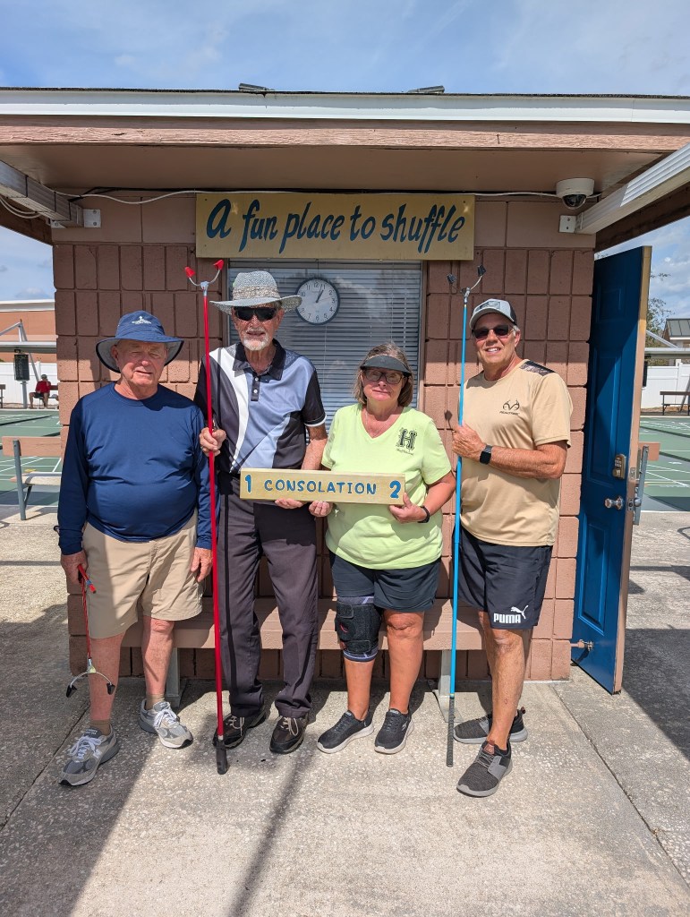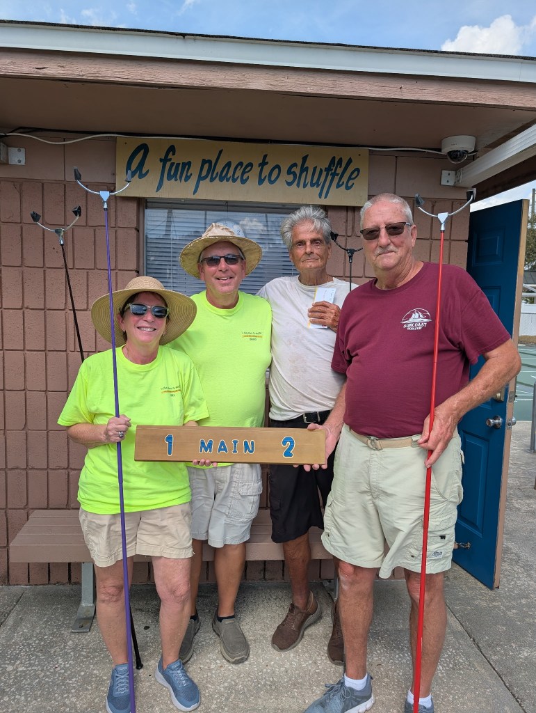 ND19 – Any Doubles – Deland Shuffleboard – 2/6/26 – 29 Teams MAIN: 1. Richard Tallman & Al Dronsfield – Leesburg 2. Christine Giumarra & Walt Bartels – Deland 3. Tony Angelo & Jeff Geesey – Coronado-Mainland/Leesburg 4. Brad & Val Simons – Deland