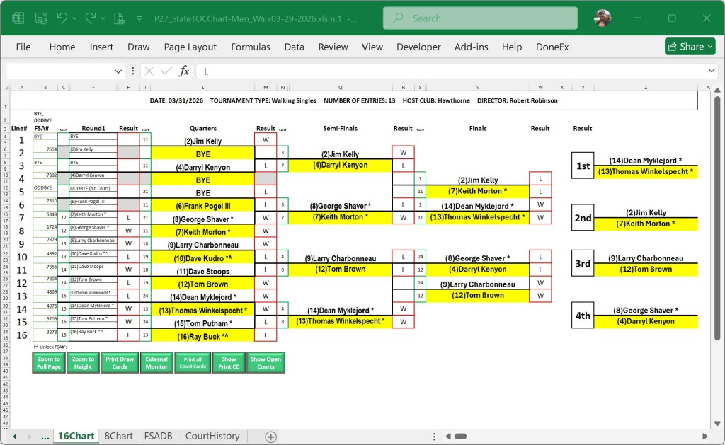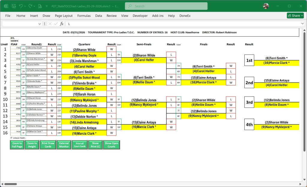 The Deland Shuffleboard Club hosted the 2025-2026 ND Masters Tournament. Chris Inga was our director. The Deland SBC, CMS SBC, Bob Robinson and Robert Shuford were our sponsors for the tournament. Brad & Valerie, Joe Inga as well as all their volunteers did a fantastic job setting everything up with all the decorations and support. Donuts, coffee and cookies throughout. The tournament board was beautiful and so easy to read. Thanks to the hardest working people, our pushers who got the discs back to the players so quickly and spent the days standing in the sun. Congratulations to everyone who played.