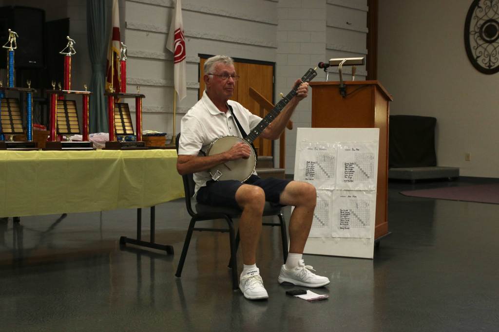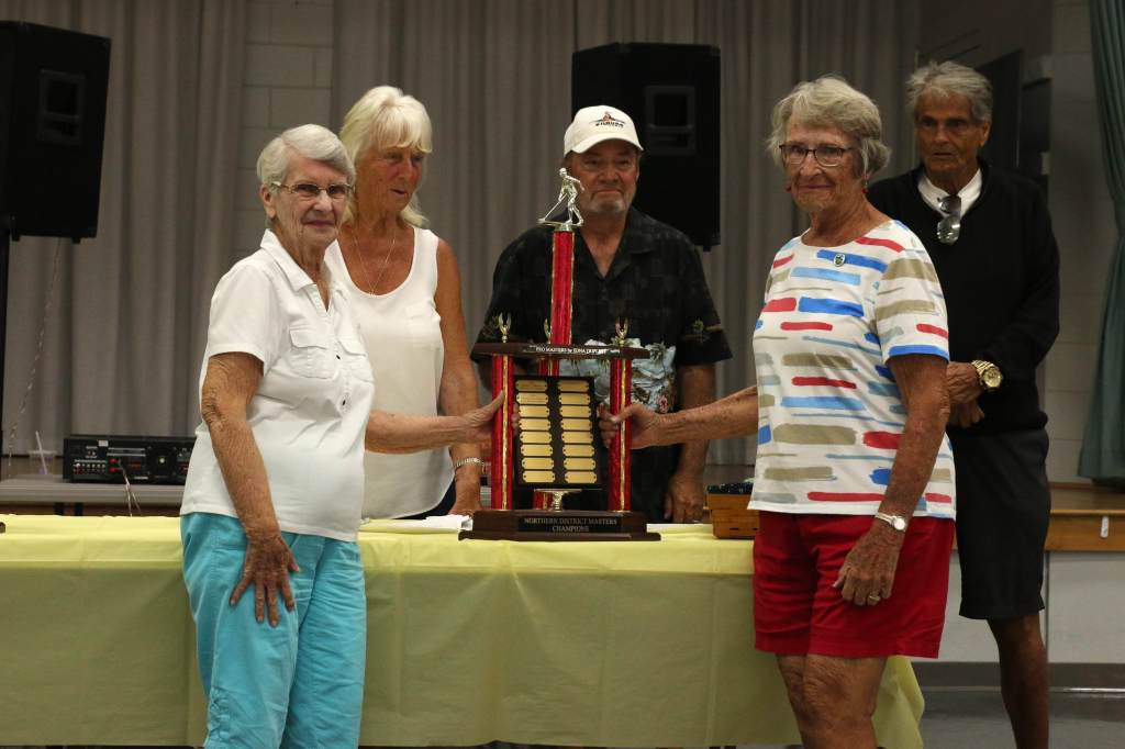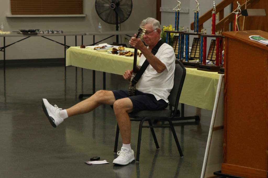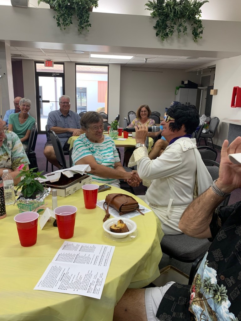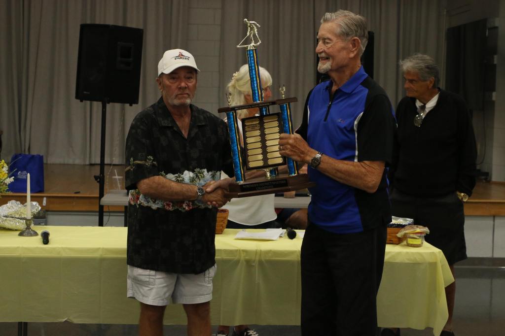 The Leesburg Shuffleboard Club hosted the 2023 Masters Tournament. Rod Lewis was the Director and Gail Howell and Carol Helfer did a great job organizing the tournament and setting up all the food and entertainment for the Masters Banquet which followed the tournament. Stan Williamson was the MC for the night’s entertainment. There were trophy presentations, pin presentations and entertainment by Rick Enright as Elvis, Jim Faust playing his banjo and Zak Wonson and Joe Inga as Abbot and Costello. They presented George Snyder with an Iron Man Award for successfully playing in all Northern District Tournaments this season. Stan had some really big red underwear? Tom Brown and Gloria Boring were presented with the Frank Wilson Special Award for Amateur Winners of the TOC.