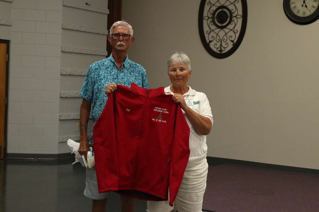 Ray Parlberg was well on his way to Hall of Fame when his wife became ill. He is now 89 years old and has done so much to promote the ND Shuffleboard that he was given an honorary entry into the Hall of Fame and presented with the traditional Red Jacket. Congratulations to all the shufflers, have a really great and safe summer.