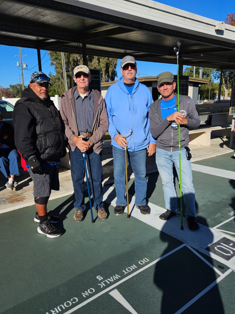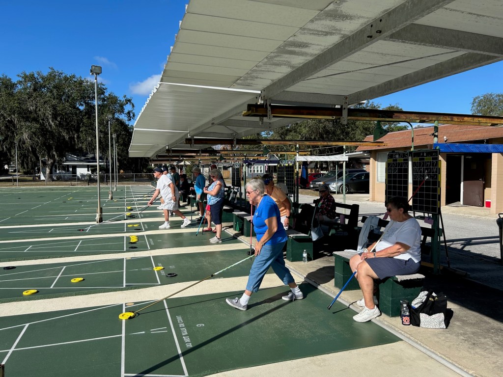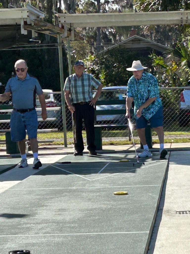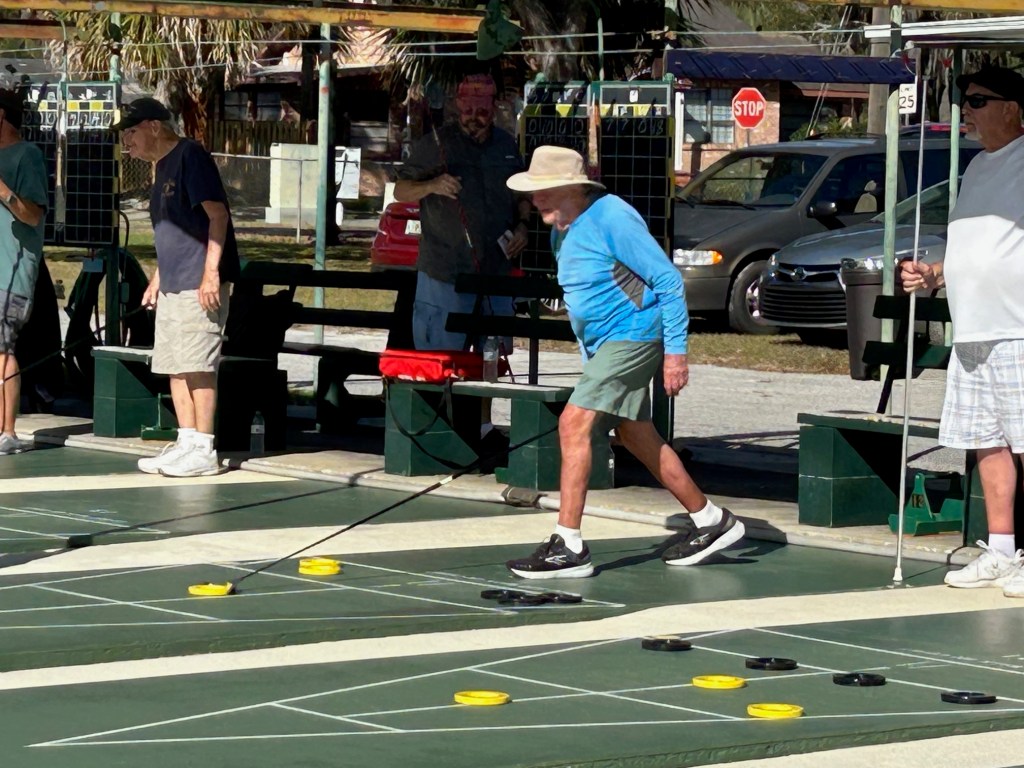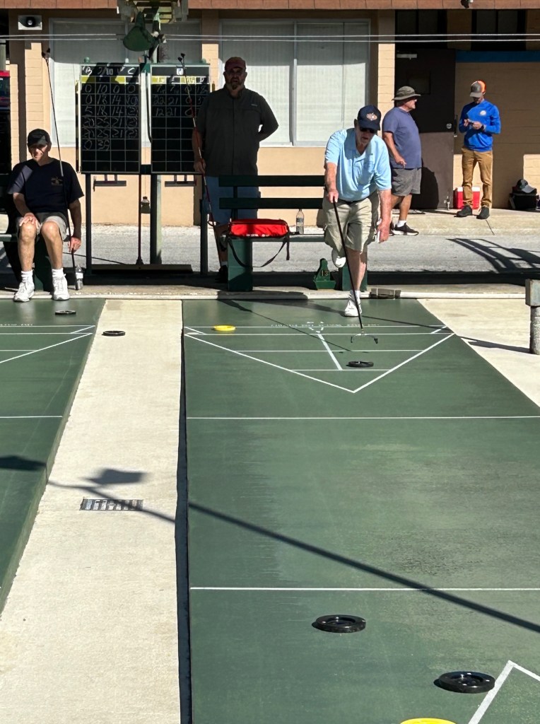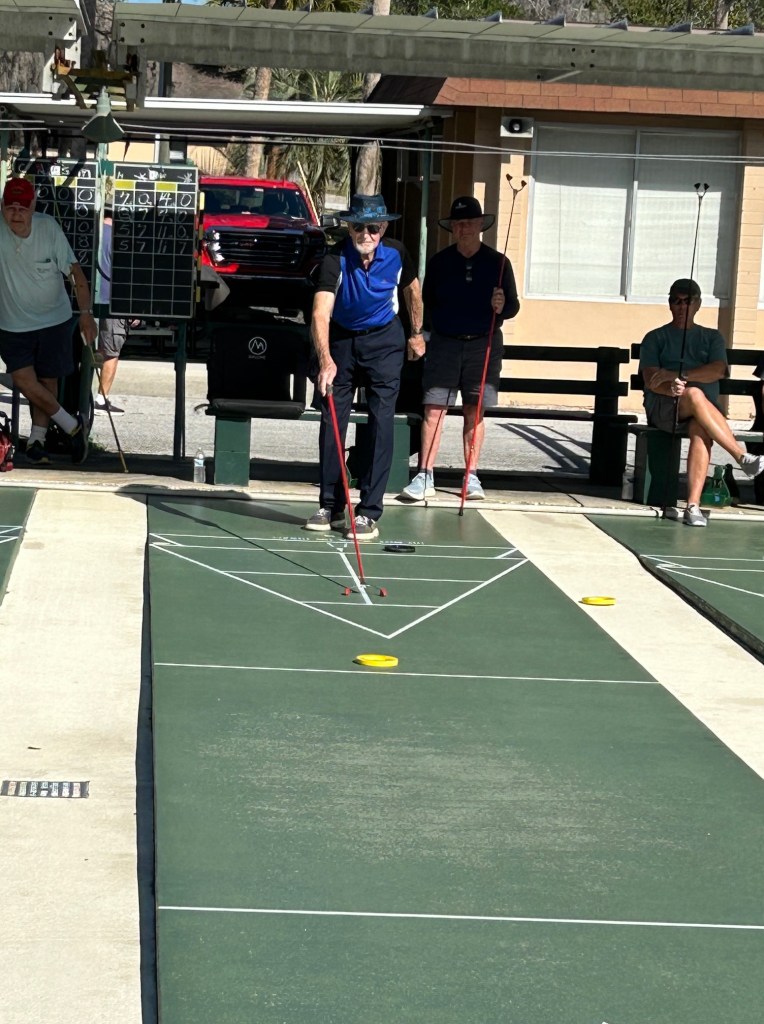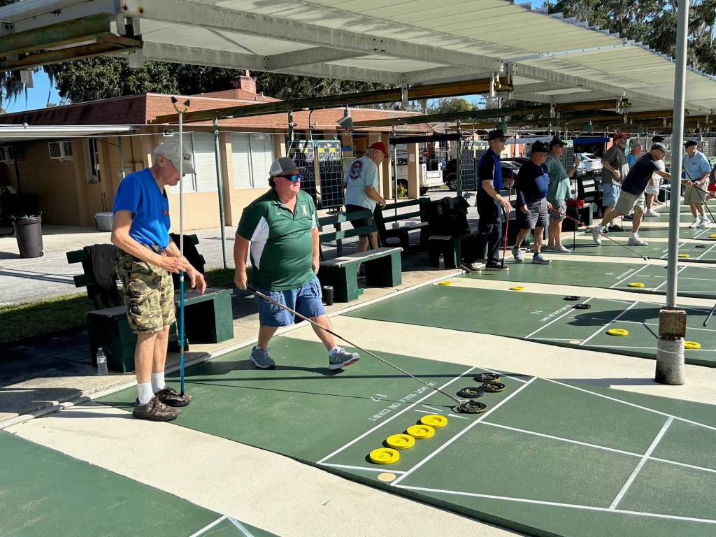 The Tavares Shuffleboard Club hosted State Amateur Tournament A16b on January 29, 2024 . Eleven teams participated from Mid FL Lakes, Hawthorne, Holiday RVV, Leesburg and Clermont. Rod Lewis was the director and Edward Jones and All American Washers were the sponsors. The director had a few close calls.