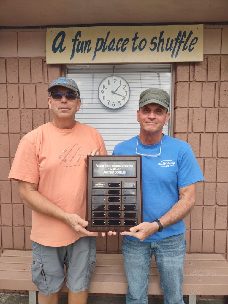 Joe Inga presented the Trophy to the winners of the State Red Line A11 Any Amateur Doubles tournament. Congratulations to Brad Simons and Steve Clark. Congratulations to all the shufflers who came to play.