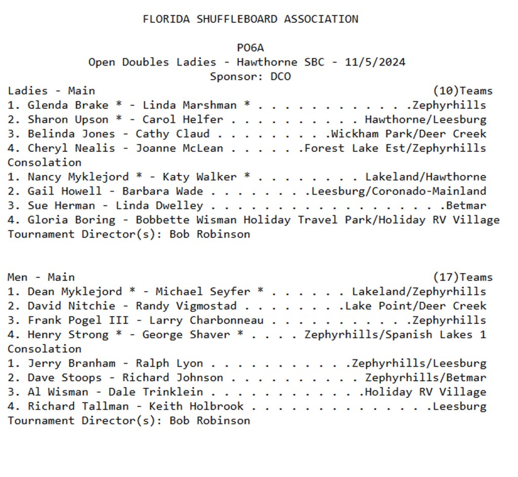 The Hawthorne Shuffleboard Club hosted the State PO6 Ladies/Men’s Open Doubles tournament on Nov. 5, 2024. The director was Bob Robinson and the Sponsor was DCO. Congratulations to all the shufflers.