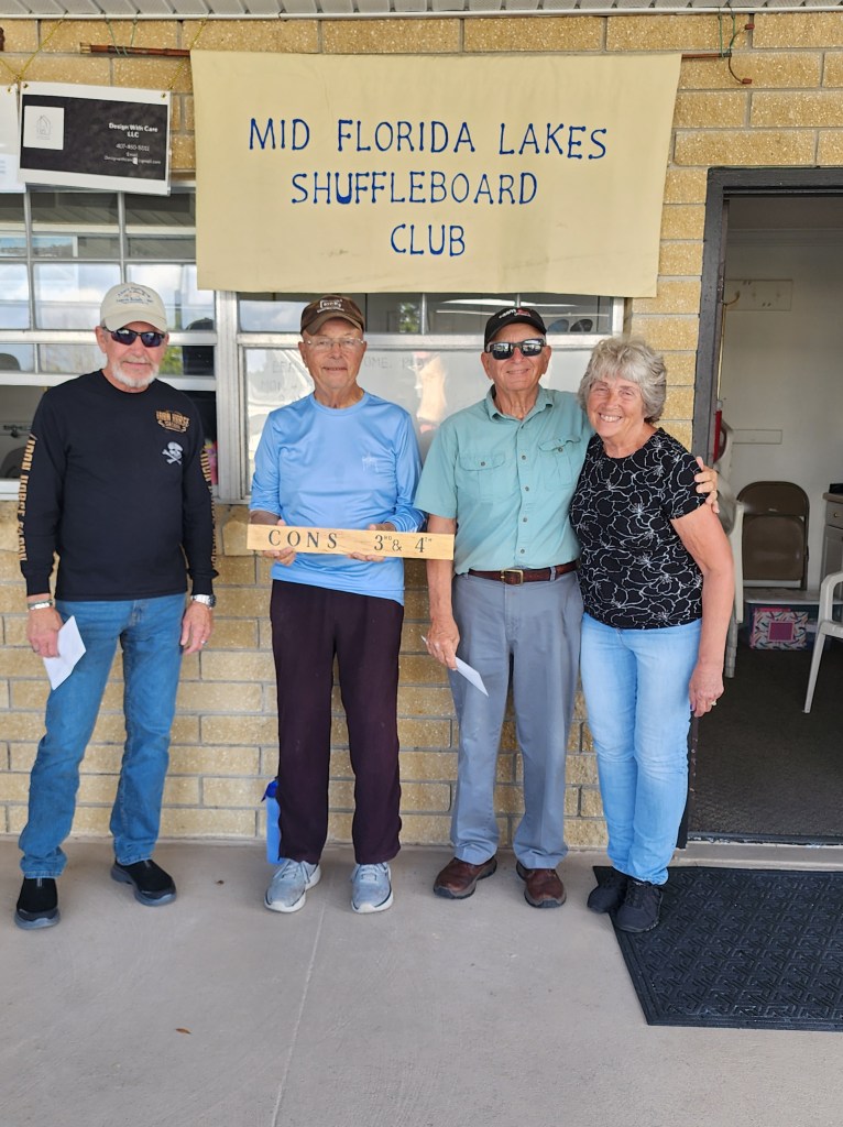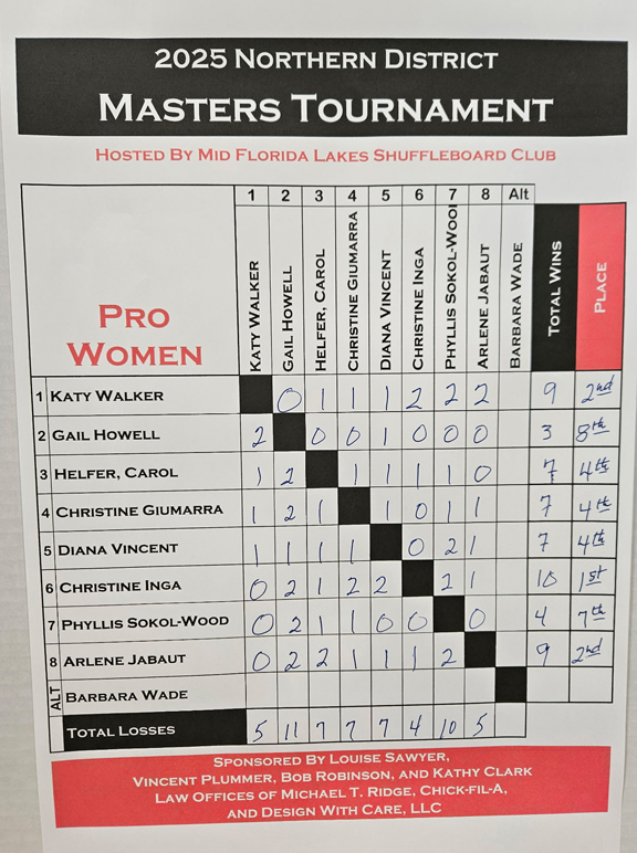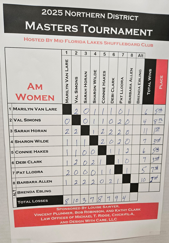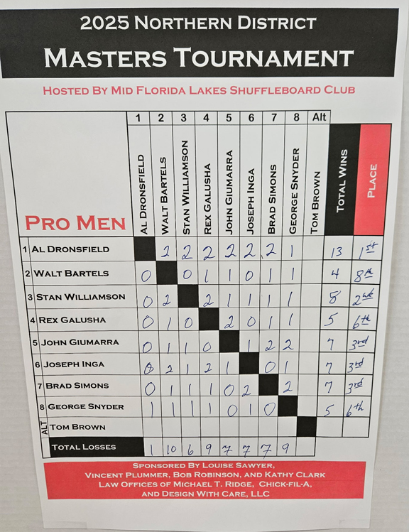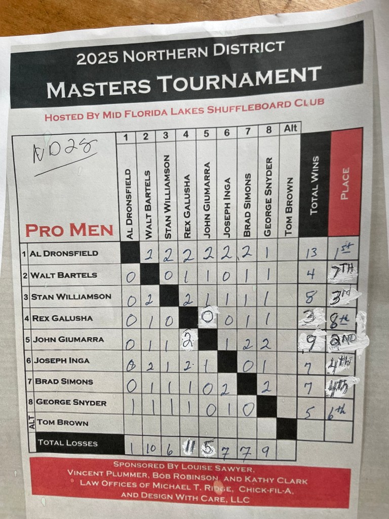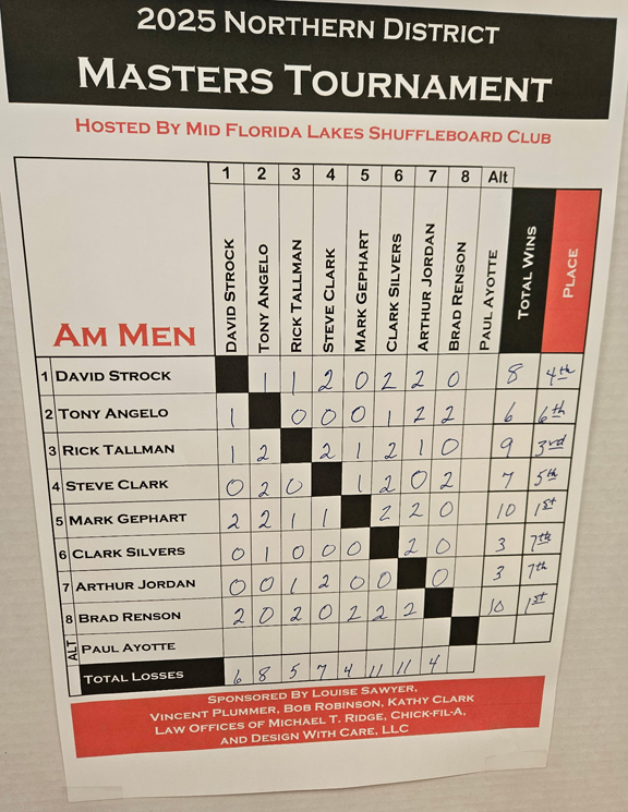 On March 27th, the Mid Florida Lakes Shuffleboard Club hosted the Northern District Masters Tournament. Bob Robinson was the Director. Thank you to all the volunteers/pushers who made the day complete. Congratulations to all the shufflers.