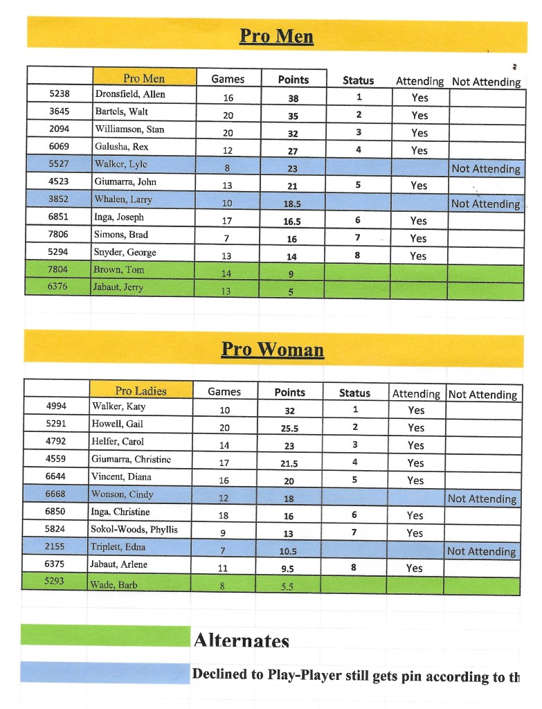 Please note that there was an error in recording the results from the Masters Tournament. Apparently the matches between John Giumarra and Rex Galusha were recorded in reverse so the final results for the Pro Men in the Masters should read: