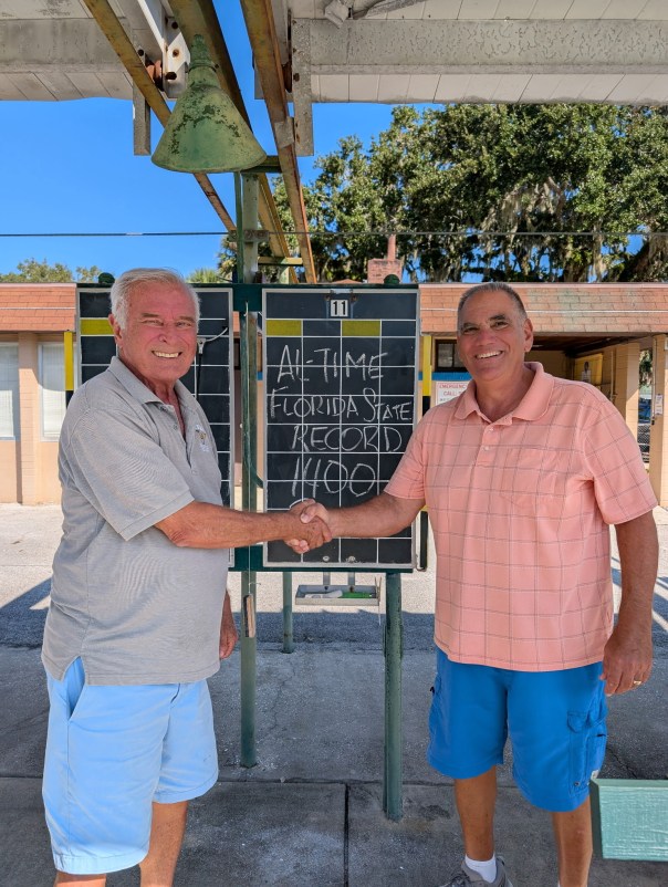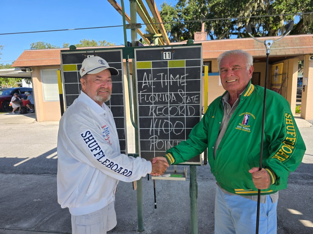 Northern District President Joe Inga congratulates Earl Ball on getting his 1400 career points making him the all-time leader in the shuffleboard community. Earl Ball achieved this accomplishment attending and placing in 1st place men’s main in the State FSA open tournament held in Leesburg, Florida.  Al Dronsfield was his partner.  Congratulations Earl