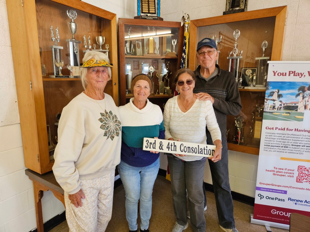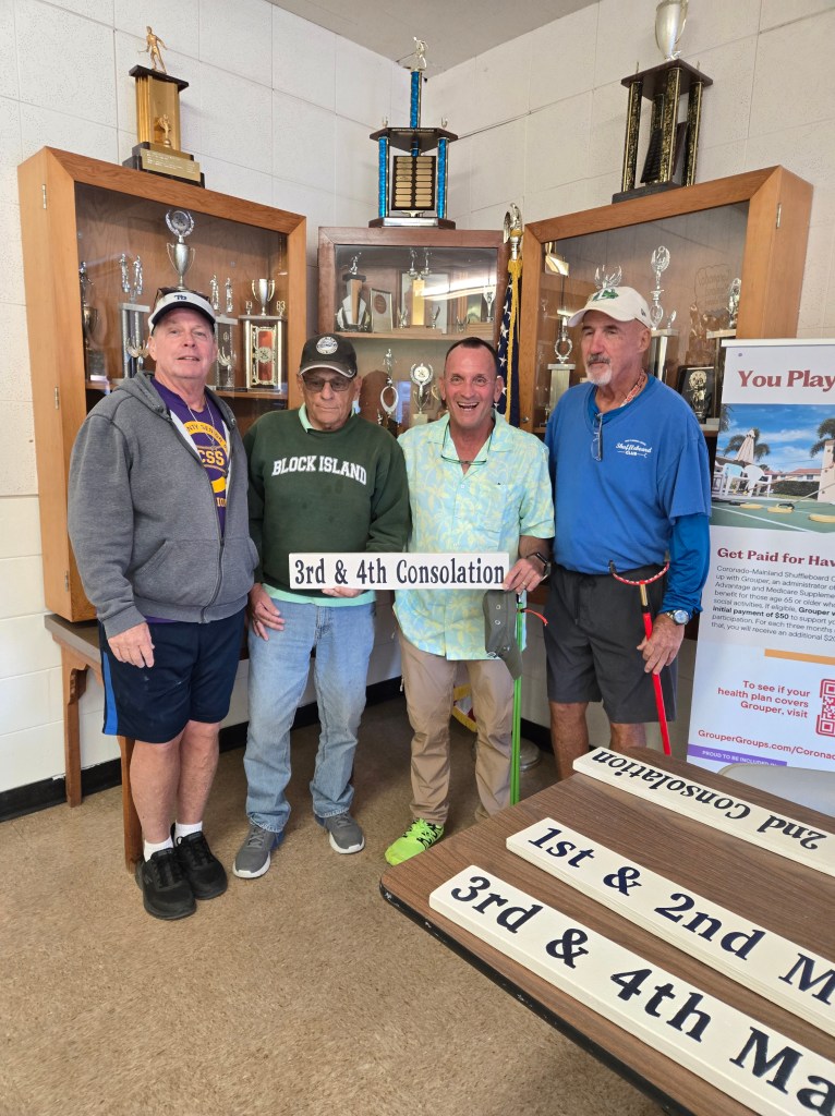 The Coronado Mainland Shuffleboard Club hosted the ND08 Any Doubles Tournament on Nov 14, 15, 2024. Arlene Jabaut was to be our director but due to an illness Jerry Jabaut stepped in and with some help from friends did a good job of directing. Chris Inga finished up on day 2. Our sponsors were G & W Roofing, Davis Bros HVAC, Marriott Springhill Suites, , NSB Physical Therapy, State Farm, Stellar Foot and Ankle, Arlene & Jerry Jabaut, Gail Kadar, Joyce Tivy and Zak & Cindy Wonson. Mike Beall had the courts looking fantastic and Phil Wade director on the courts. Thanks to our many volunteers who helped during the tournament. The weather was great and the competition was really good. Congratulations to all the shufflers. Sorry, I forgot the list.